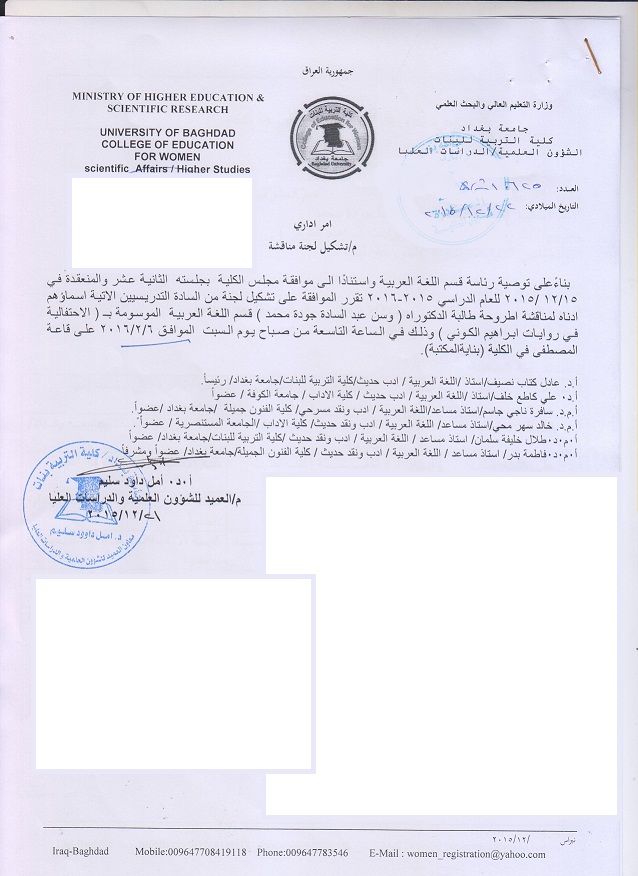 تشكيل لجنة مناقشة اطروحة الدكتوراه ” وسن عبد السادة جودة محمد ”