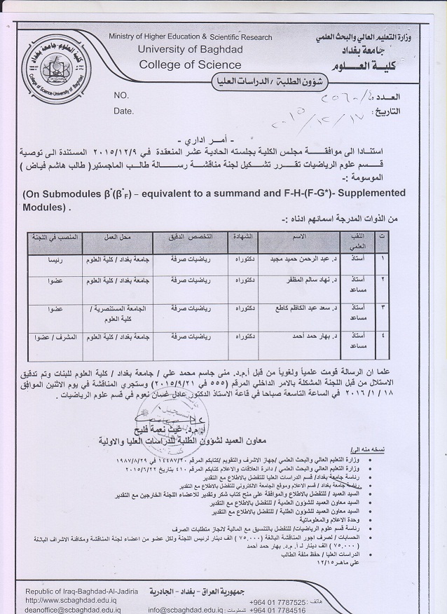 تشكيل لجنة مناقشة رسالة الماجستير " طالب هاشم فياض "
