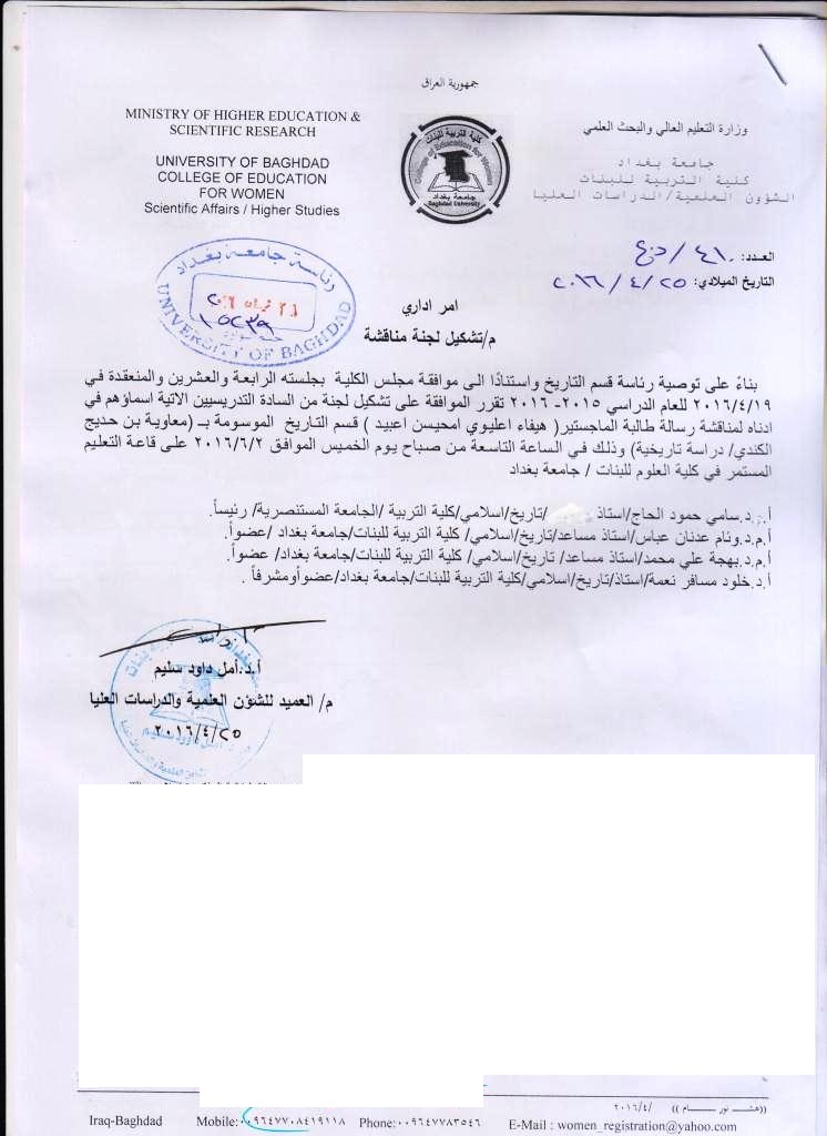 تشكيل لجنة لمناقشة رسالة طالبة الماجستير "هيفاء اعليوي امحيسن اعبيد"