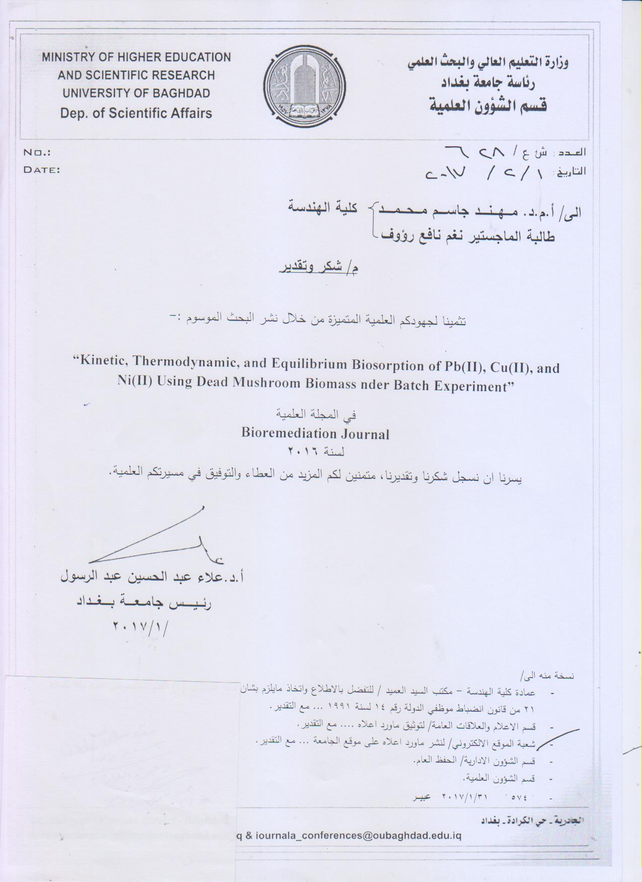 حصل أ.م.د. مهند جاسم محمد – طالبة الماجستير نغم نافع رؤوف / كلية الهندسة على شكر وتقدير من السيد رئيس جامعة بغداد الأستاذ الدكتور علاء عبد الحسين عبد الرسول تثميناً للجهود العلمية من خلال نشر البحث