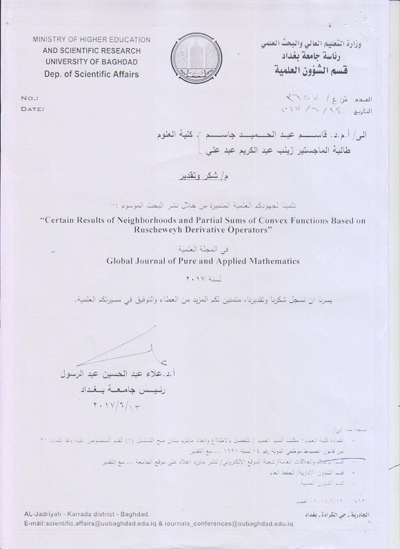 حصل أ.م.د قاسم عبد الحميد جاسم – طالبة الماجستير زينب عبد الكريم عبد علي / كلية العلوم على شكر وتقدير من السيد رئيس جامعة بغداد الأستاذ الدكتور علاء عبد الحسين عبد الرسول تثميناً للجهود العلمية من خلال نشر بحث